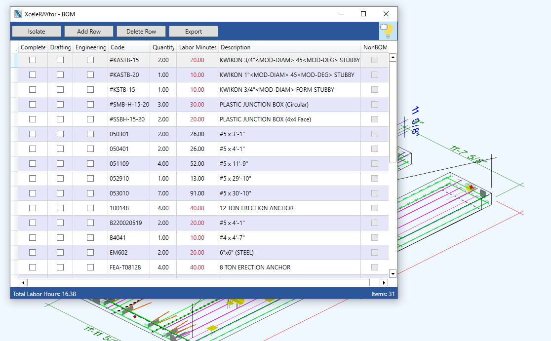 Utilizing your 3D model, generate paperless Manufacturing Instructions. Modelers can create an IFC document that can be used by all stages of the manufacturing process. Material control can receive their BOM information for a piece. Woodshop can work on all Formwork required for pieces. Crews can assemble their pieces with fewer errors and more clarity than a 2D drawing.